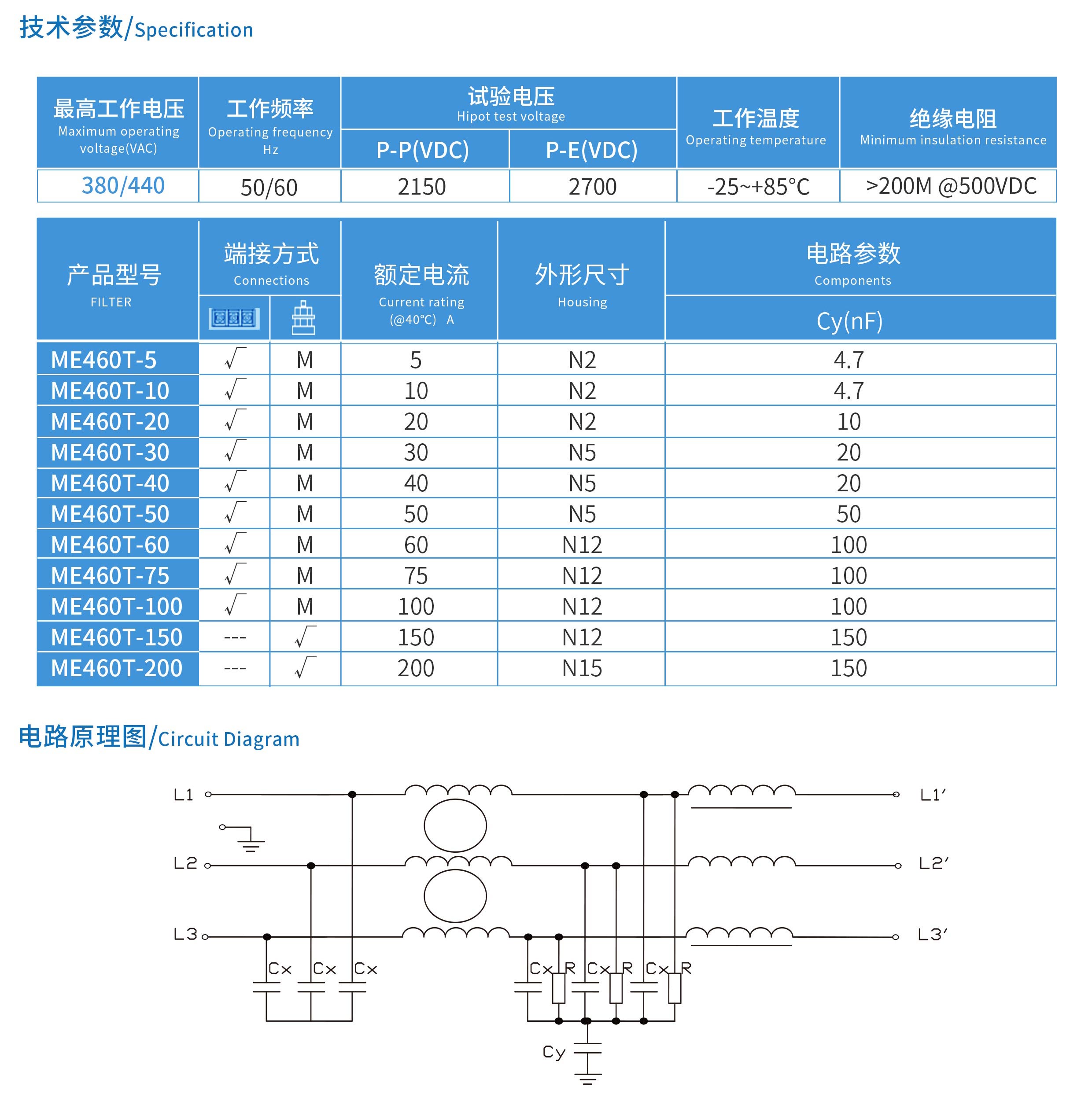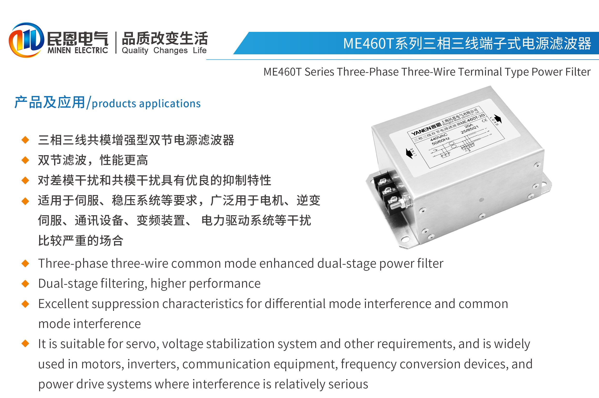 ME460T系列三相三線雙節端子式電源濾波器