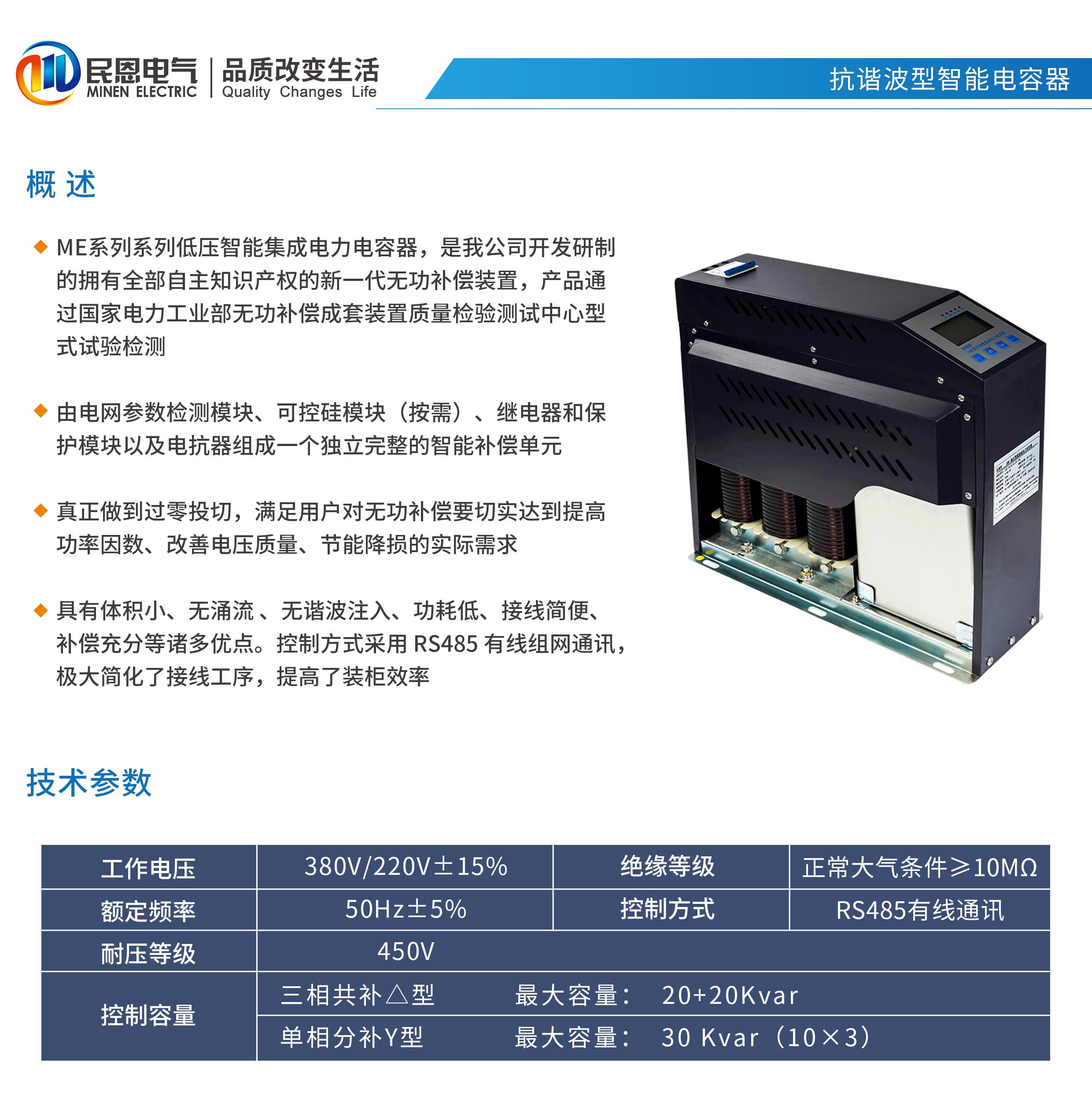 低壓智能集成電力電容器,是我公司開發研制的擁有全部自主知識產權的新一 代無功補償裝置,產品通過國家電力工業部無功補償成套裝置質量檢驗測試中心型式試驗檢 測。 產品由電網參數檢測模塊、可控硅模塊(按需)、繼電器和保護模塊以及電抗器組成一 個獨立完整的智能補償單元。真正做到過零投切,滿足用戶對無功補償要切實達到提高功率 因數、改善電壓質量、節能降損的實際需求。具有體積小、無涌流 、無諧波注入、功耗低、 接線簡便、補償充分等諸多優點。控制方式采用 RS485 有線組網通訊,極大簡化了接線工序, 提高了裝柜效率。